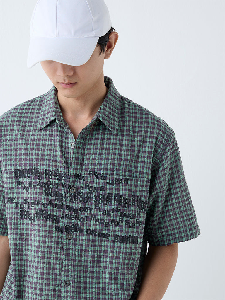 Add a playful edge to your off-duty style with this green shirt from Nuon. Milled from pure cotton in a relaxed fit, it carries a spread collar that extends to a button placket and short sleeves. Finished with bold text prints layered over the checks, it brings a street-inspired twist to your casual rotation.