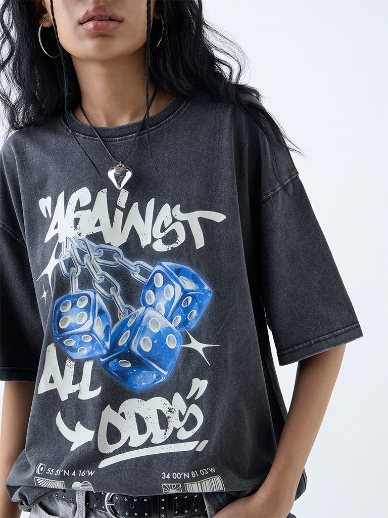 Nuon Grey Printed Cotton T-Shirt