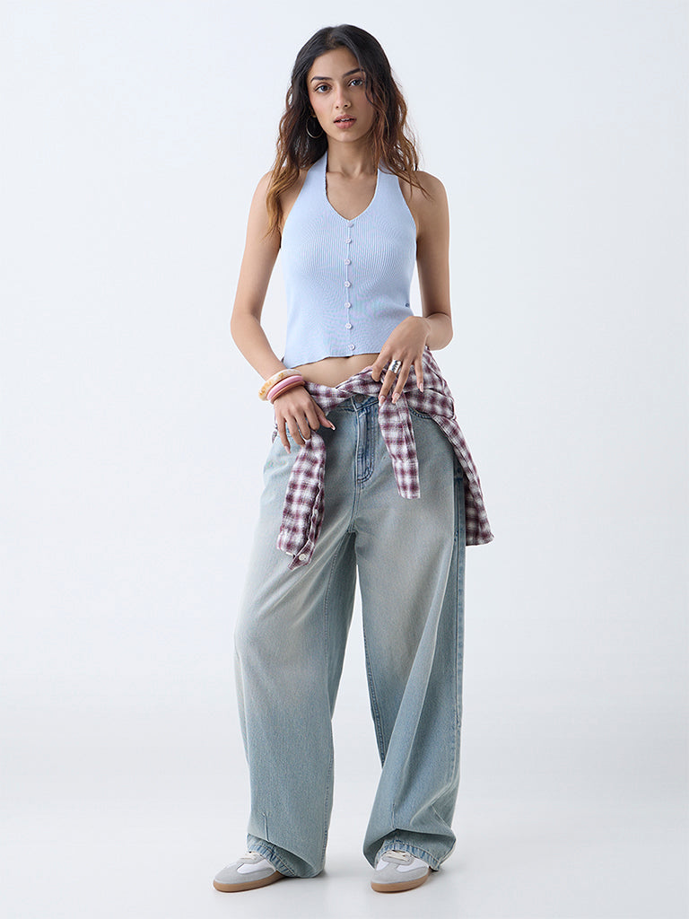 Nuon presents this light blue top, crafted from a soft, breathable fabric with a ribbed texture that subtly defines its fitted silhouette. Designed with a halter-neck, a button-up front and a sleeveless profile, this versatile piece instantly uplifts casual outfits with its effortless charm.