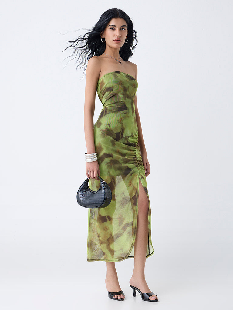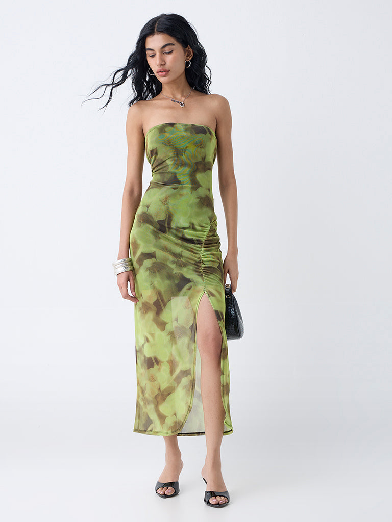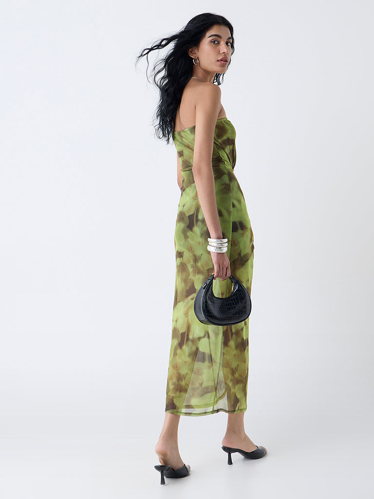 Turn heads at brunches or evening outings with this lime tube dress from Nuon. Adorned with a bold floral motif, it celebrates confident style while the body-hugging silhouette and off-shoulder neckline add a modern edge.