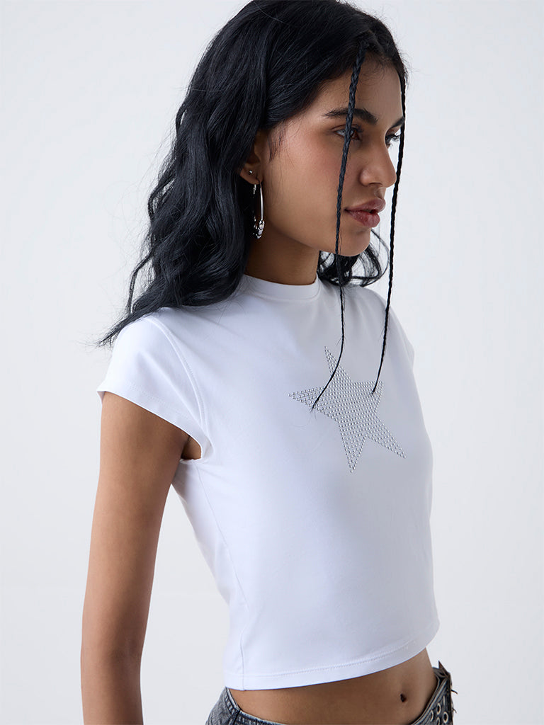 Nuon White Embellished Cotton-Blend T-Shirt