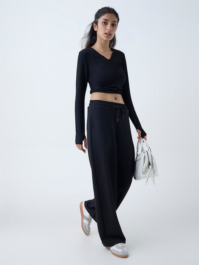 Studiofit reworks everyday essentials with this black t-shirt, crafted from a ribbed lightweight fabric for comfort and ease. It features a V-neck and full sleeves, adding subtle structure to its laid-back silhouette. An ideal selection for both activewear and casual occasions.