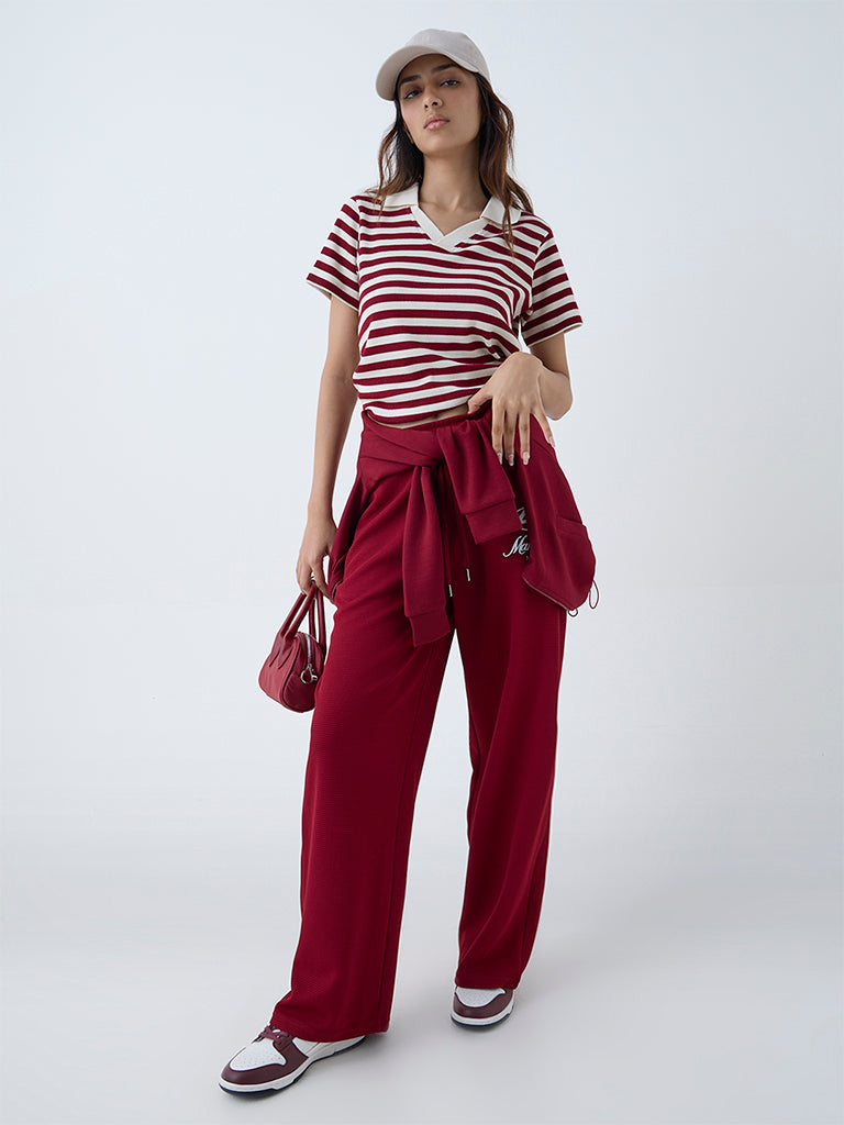 This maroon t-shirt from Studiofit is framed with a polo neck and short sleeves, giving it a defined look. Crafted from cotton-blend fabric with a textured finish, it showcases bold stripe prints that elevate its casual appeal. A versatile piece that transitions effortlessly between relaxed moments and active routines.