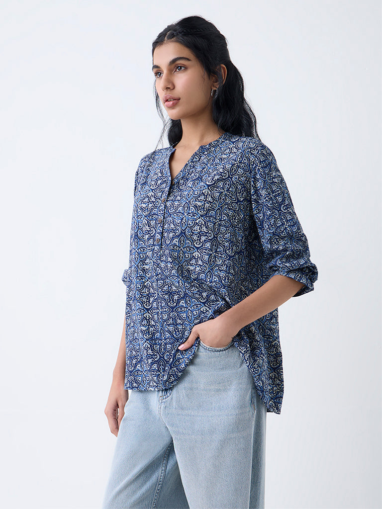 Bring effortless artistry to your daily wardrobe with this indigo tunic from Utsa. Vibrant prints inspired by nature merge seamlessly with contemporary Indo-western design. Woven from a breathable fabric, it features a mandarin neck and a brief button placket for subtle structure, while three-fourth sleeves allow fluid movement.