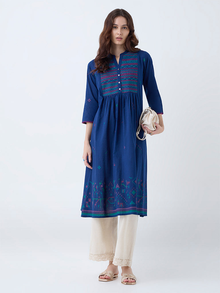 Utsa Indigo Embroidered Cotton A-Line Kurta