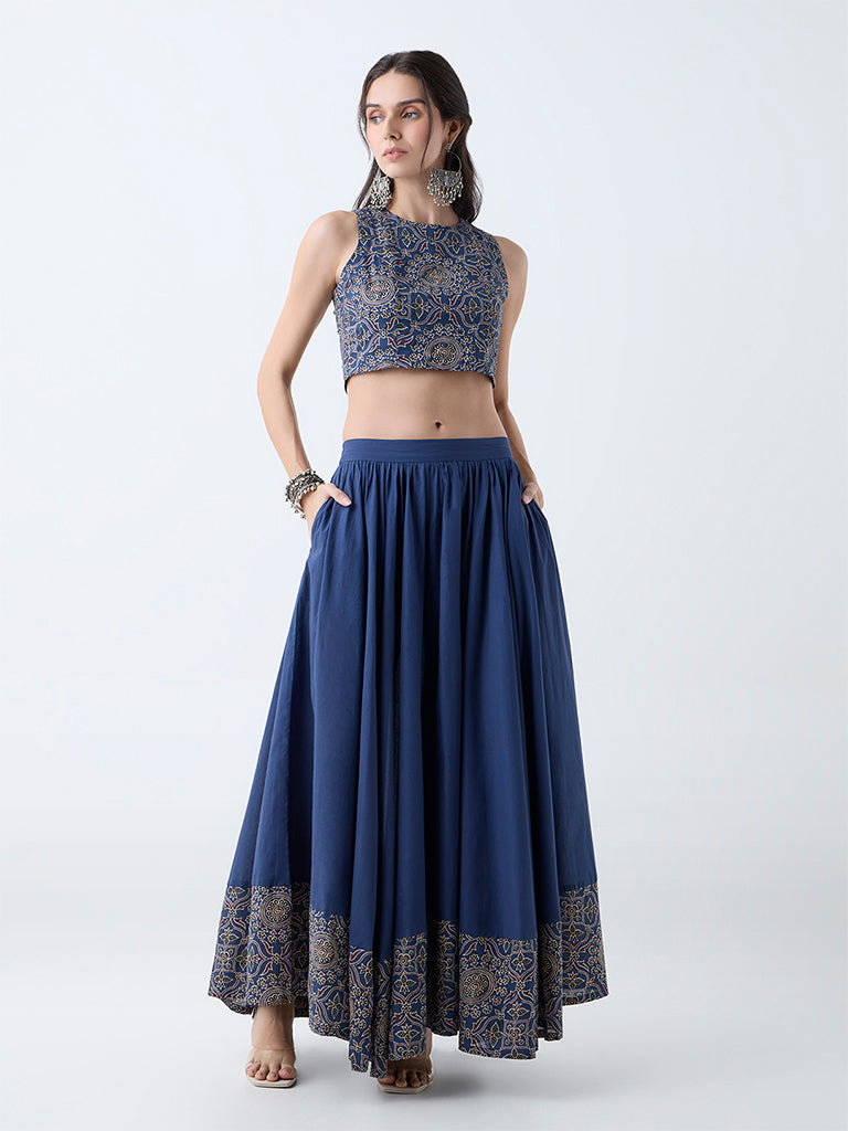 Bring a hint of festive charm to your look with this indigo skirt from Utsa. Accented with appealing ethnic prints along the hem, it lends character to its otherwise minimalist design. Woven from premium-quality fabric for a lightweight feel, it is finished with an elastic waist and side pockets, balancing practical ease with effortless style.
