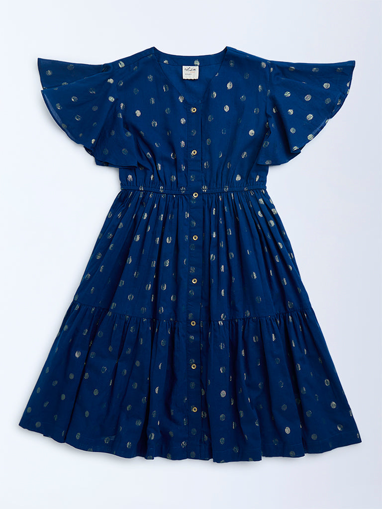 Utsa Kids Dark Blue Badla Pattern Fit-and-Flare Cotton-Blend Dress - (8-14yrs)