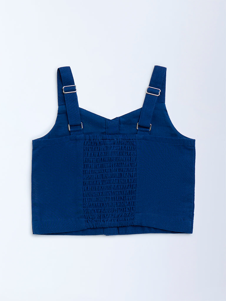 Utsa Kids introduces a festive favourite with this navy ethnic top, crafted for comfort and charm. Delicate floral embroidery lends a graceful touch, while the V-neck and adjustable shoulder straps keep the look stylish and easy to wear. A smocked back ensures a snug fit, and its breathable fabric composition makes it perfect for celebrations.