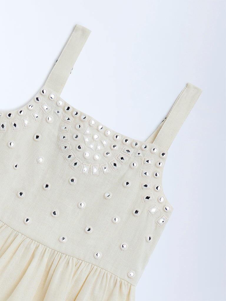 Utsa Kids Off-White Mirror-Work Detailed Cotton Tiered Dress - (2-8yrs)