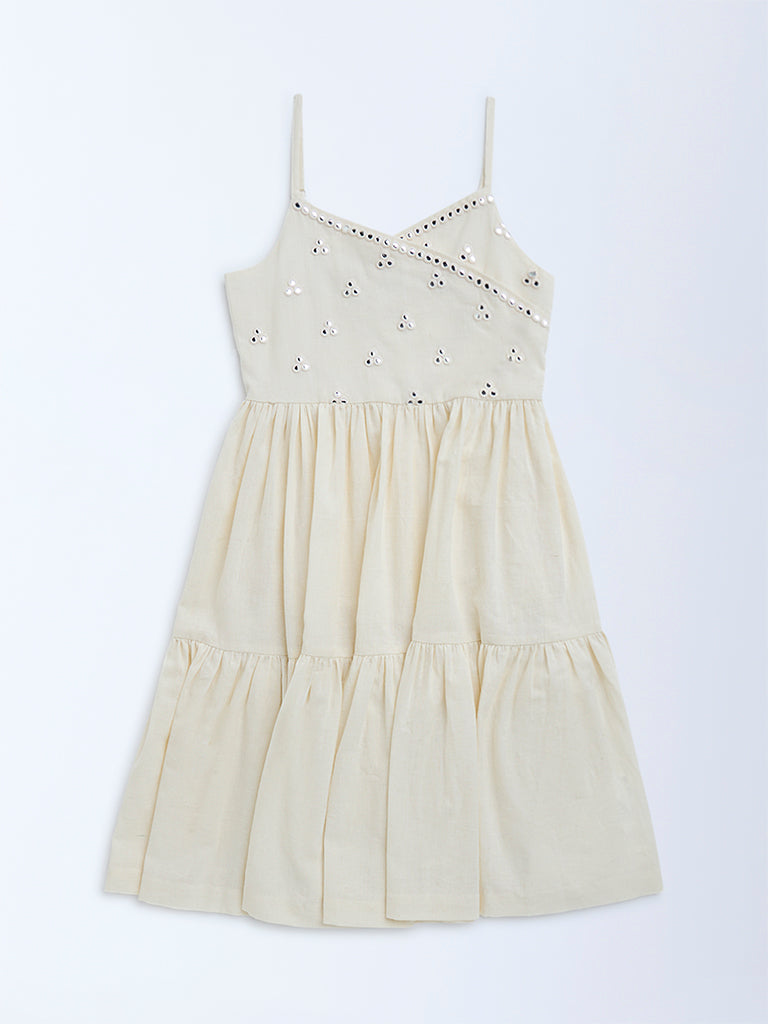 Utsa Kids Off-White Mirror-Work Detailed Cotton Tiered Dress - (8-14yrs)