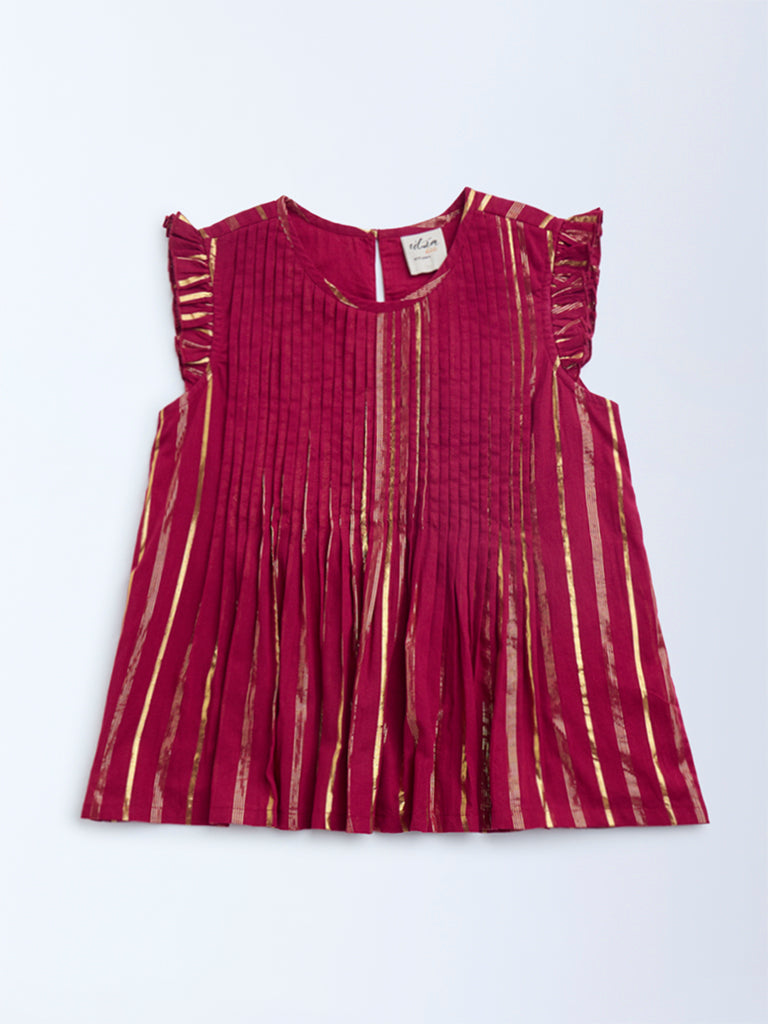 Perfect for festive celebrations, this red ethnic top from Utsa Kids blends comfort with celebratory charm. Gold-toned stripes and a pintuck-detailed bodice add a touch of occasion-ready sparkle, while the cotton-blend fabric keeps her comfortable throughout the day. Finished with a round neck and ruffled sleeves, it’s an easy-to-style piece that pairs well with skirts or leggings.