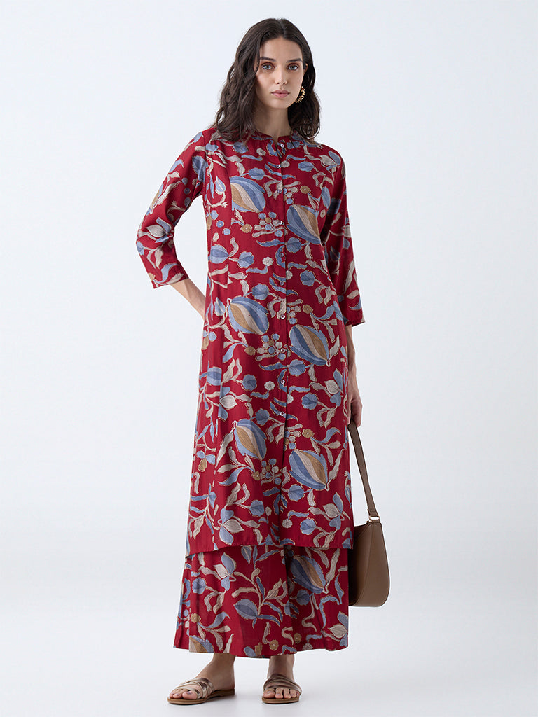 Turn heads this festive season with these maroon palazzos from Utsa, adorned with vibrant foliage patterns for a stylish statement. Constructed from a breathable fabric, they feature an elastic waistband with adjustable drawstrings, ensuring a comfortable fit.