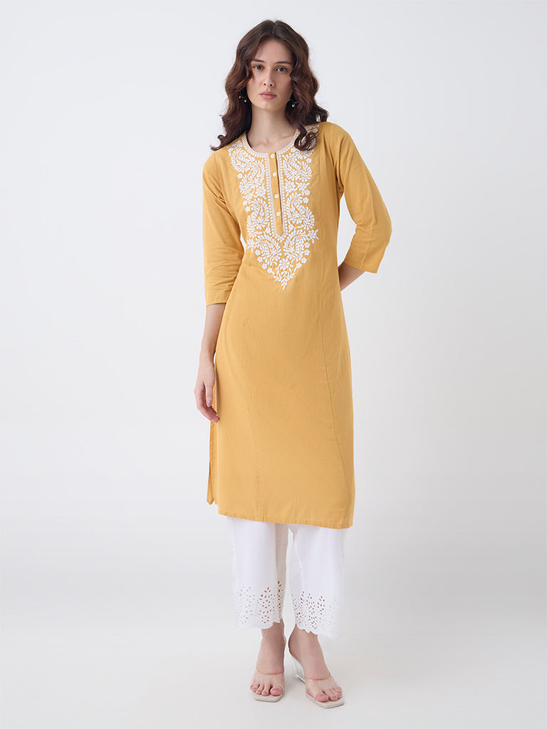 Enhance your festive wardrobe with this mustard kurta by Utsa. Adorned with intricate embroidery at the yoke, it is made from a cotton-blend fabric in a graceful A-line silhouette. The notched neck, short button placket, and three-quarter sleeves frame the design gracefully, while a discreet slip pocket enhances practicality.