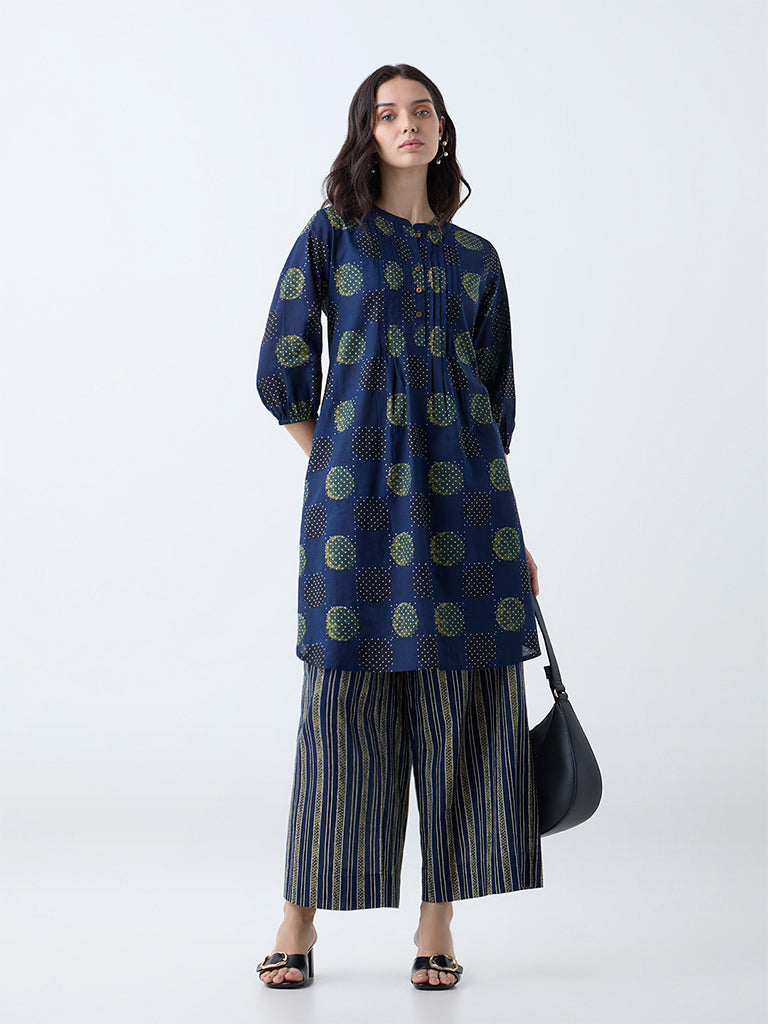Up your festive game with this navy kurta from Utsa, adorned with vivid badla prints and intricate pintuck detailing on the bodice. Woven from pure cotton for enhanced comfort, it is framed with a band neck collar, a button-up front, and peasant sleeves. Finished with a practical slip pocket, it blends festive elegance with everyday ease.