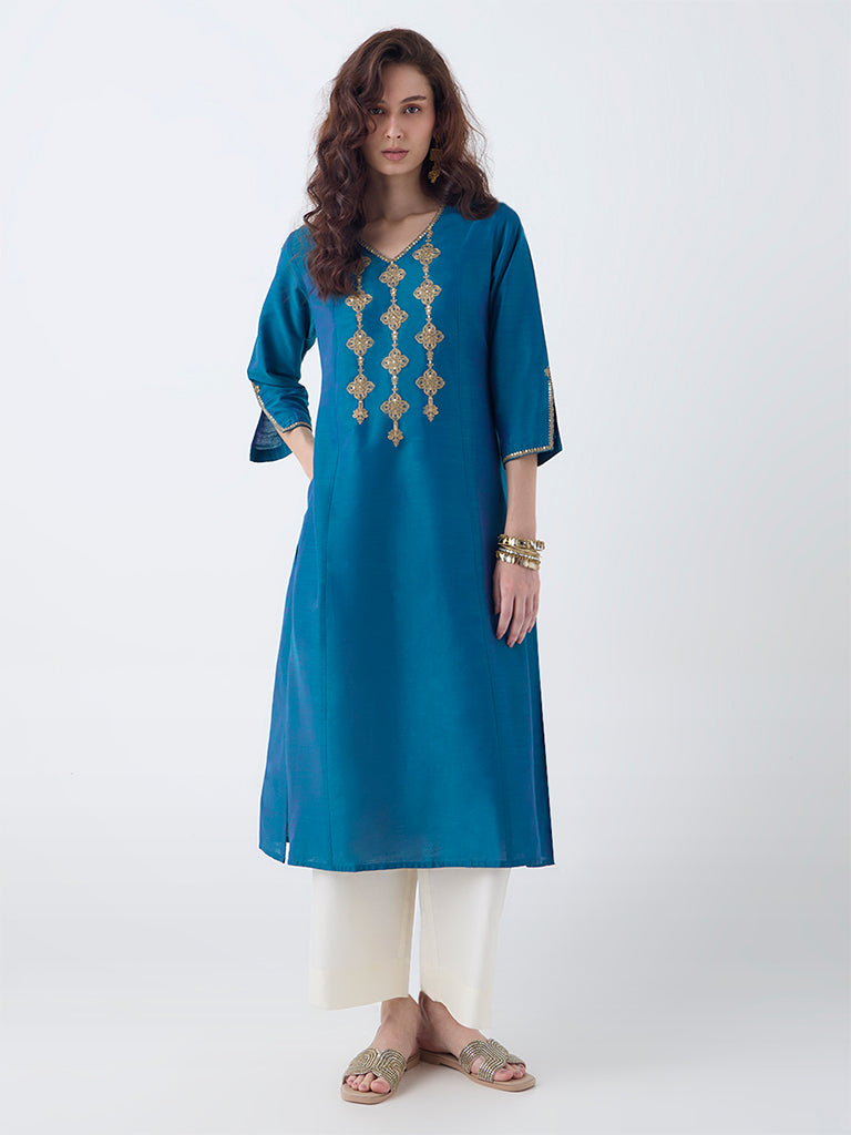 Bring a touch of festive vibrance to every gathering with this teal kurta from Utsa. Cut in a flowing A-line silhouette, it is created from a sumptuous fabric that ensures all-day comfort. The yoke is detailed with intricate zari embroidery, while a V-neck and three-quarter sleeves add refined charm. A discreet slip pocket completes the design with practical ease.