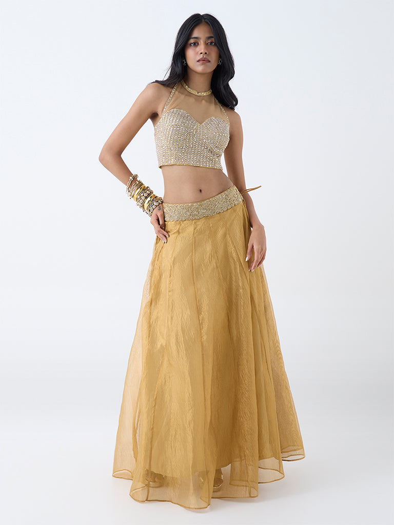 This gold ethnic skirt by Vark is crafted from a lightweight tissue fabric that drapes effortlessly, offering a fluid silhouette. The elasticated waistband is detailed with intricate embellishments, while beaded tassel ties on the sides add a festive accent. Side pockets complete the design, making this skirt a graceful choice for celebratory occasions.