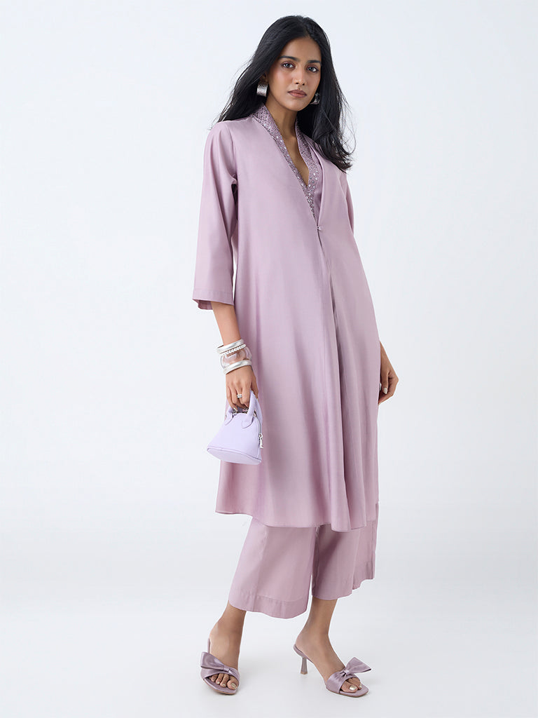 This lilac ethnic set from Vark is a timeless pick for festive evenings and celebratory gatherings. The kurta, cut in a graceful A-line silhouette, features three-quarter sleeves and a V-neckline with delicate sequin embellishments that lend just the right touch of sparkle. Paired with matching pants fitted with an elastic waist for comfort, the ensemble blends ease with elegance.
