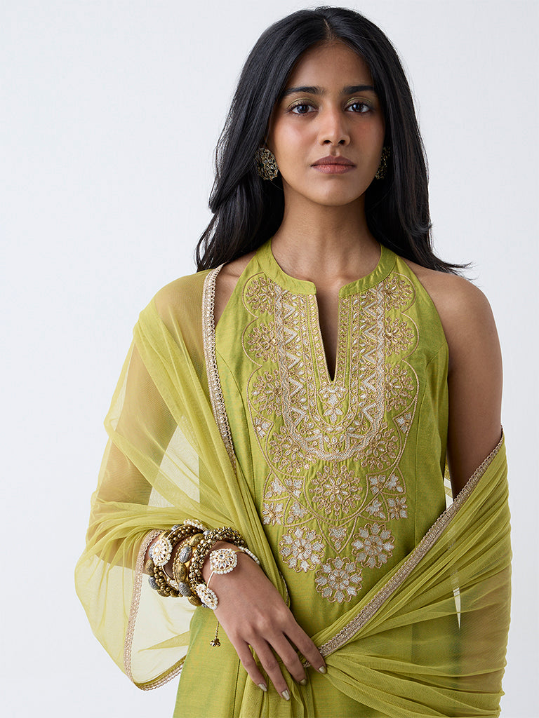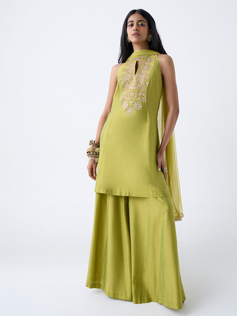 Celebrate tradition with a touch of grandeur in this lime ethnic set from Vark. Constructed from premium-quality fabric, the kurta is decorated with intricate floral embroidery at the yoke and styled with a split neck and sleeveless cut for a modern edge. Wide-leg palazzos with an elasticated waist ensure comfort, while the matching sheer dupatta, finished with a zari border, completes this festive ensemble with timeless elegance.