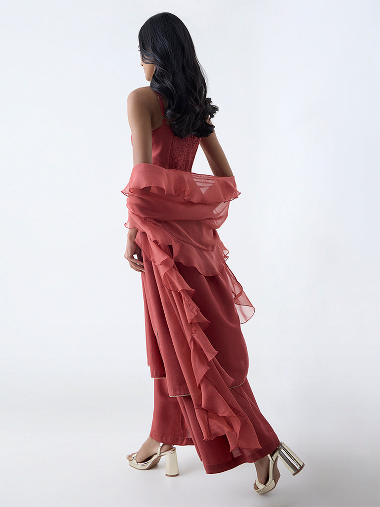 Vark presents this rust ethnic set, crafted from a lightweight fabric for day-long comfort. The embellished A-line kurta features a square neck, adjustable straps and a smocked back for a flattering fit. It is paired with flared pants featuring an elasticated waistband and a ruffled dupatta, making it well-suited for festive gatherings and special occasions.