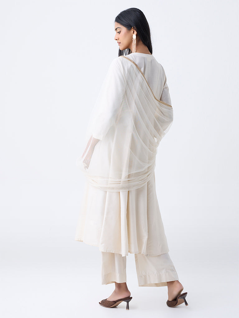 This white Anarkali set from Vark turns every festive moment into a picture-perfect celebration. Crafted for special occasions, the kurta’s embroidered yoke and V-neck frame a graceful silhouette, while three-quarter sleeves add a touch of elegance. Ethnic pants with an elasticated waistband move with ease, and the soft dupatta edged with zari embroidery drapes effortlessly.