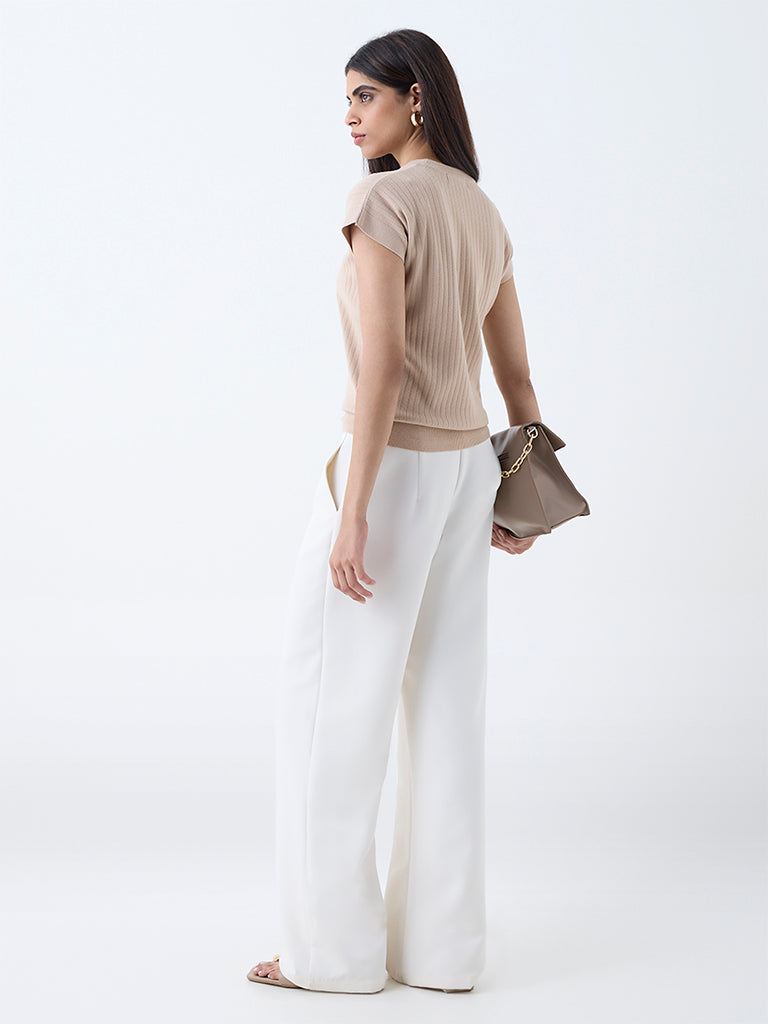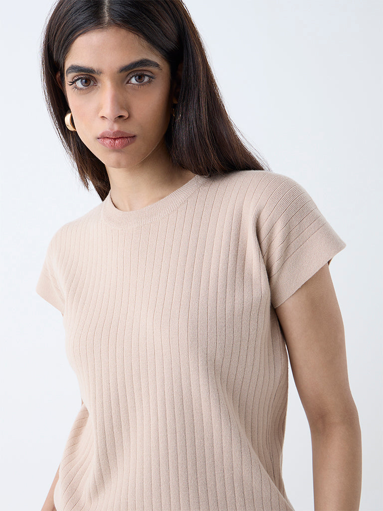 Neutral and effortlessly chic, this beige t-shirt from Wardrobe redefines polished basics. The self-striped texture adds quiet dimension, while its breathable fabric ensures all-day comfort. Designed with a round neck and cap sleeves, it pairs elegantly with structured trousers, skirts, or layering pieces.