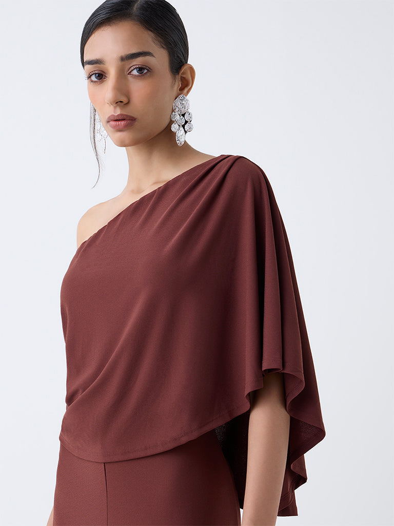 Wardrobe Brown Solid One-Shoulder Jumpsuit