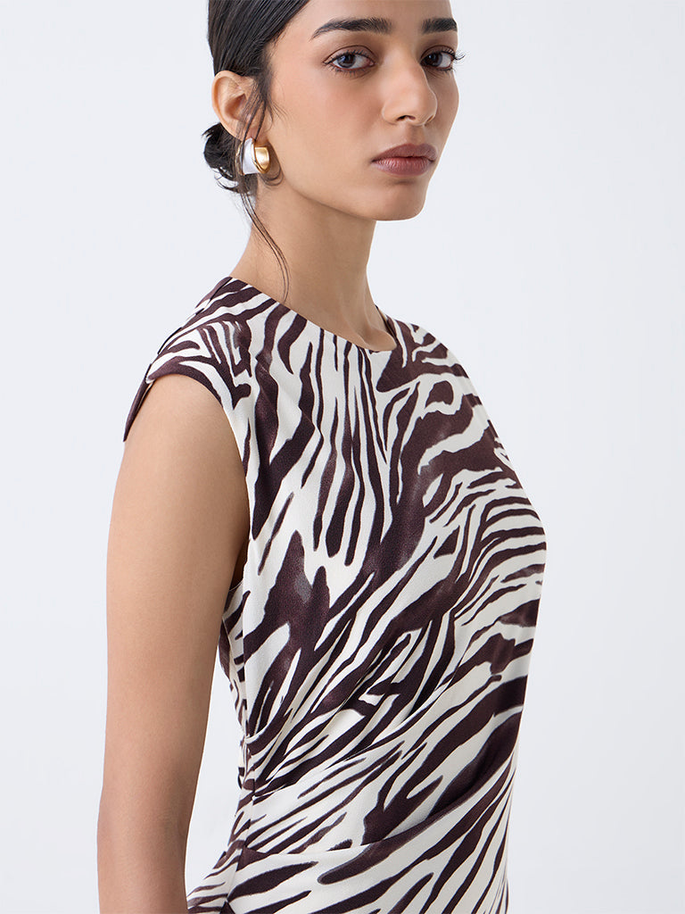 Wardrobe brings striking appeal to your repertoire with this dark brown sheath dress, enlivened by bold zebra prints. Cut in a sleek silhouette, it is tailored from a breathable fabric that offers ease through the day. A round neck and sleeveless cut lend it timeless versatility, making it equally suited for office polish or evening sophistication.