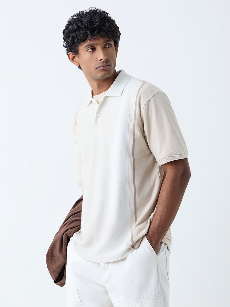 WES Casuals Beige Colour-Blocked Relaxed-Fit Cotton-Blend Polo T-Shirt