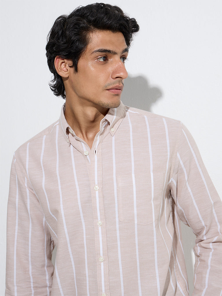 WES Casuals Beige Striped Relaxed-Fit Cotton-Blend Shirt
