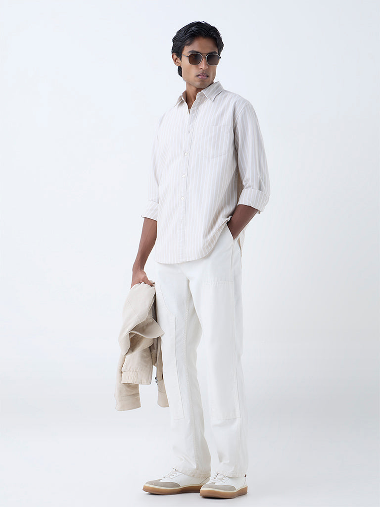 WES Casuals Beige Striped Relaxed-Fit Cotton Shirt