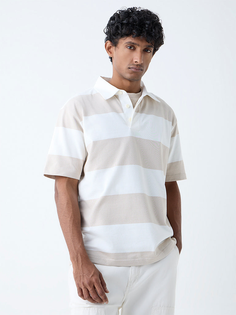 WES Casuals Beige Stripes Relaxed-Fit Cotton-Blend Polo T-Shirt