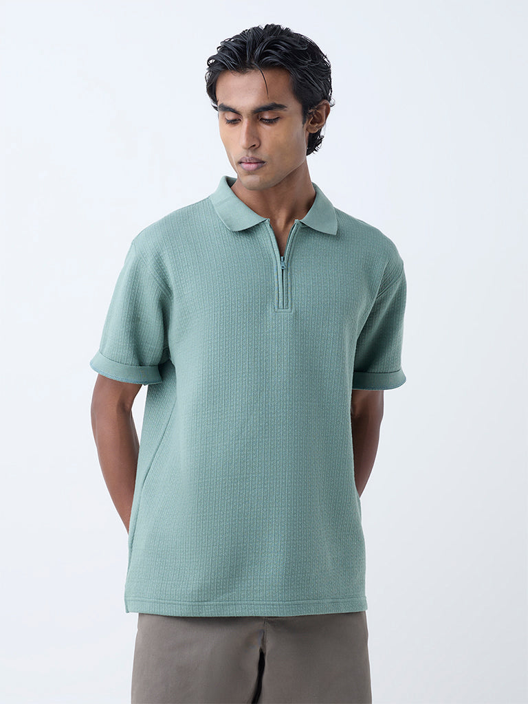 Pack smart for your next getaway with this sage polo t-shirt from WES Casuals. Woven from a self-textured fabric in a relaxed fit, it’s styled with a sleek zipper placket, classic collar and short sleeves for effortless versatility.