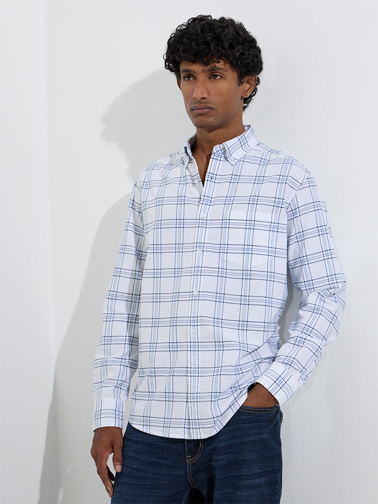 Carved in a relaxed silhouette, this white shirt from WES Casuals highlights checkered detailing that lends a timeless look. Its pure cotton build offers ultimate comfort, while the button-down collar, full sleeves, and chest pocket make it a versatile pick for everyday wear.