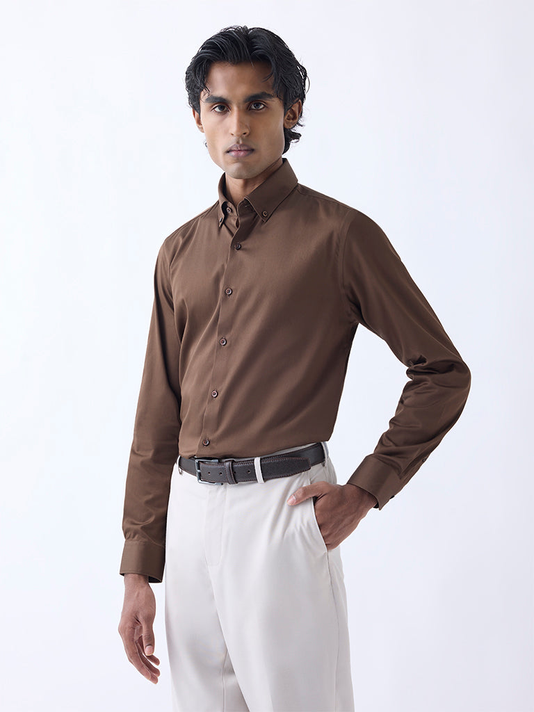 WES Formals Brown Slim-Fit Cotton-Blend Shirt