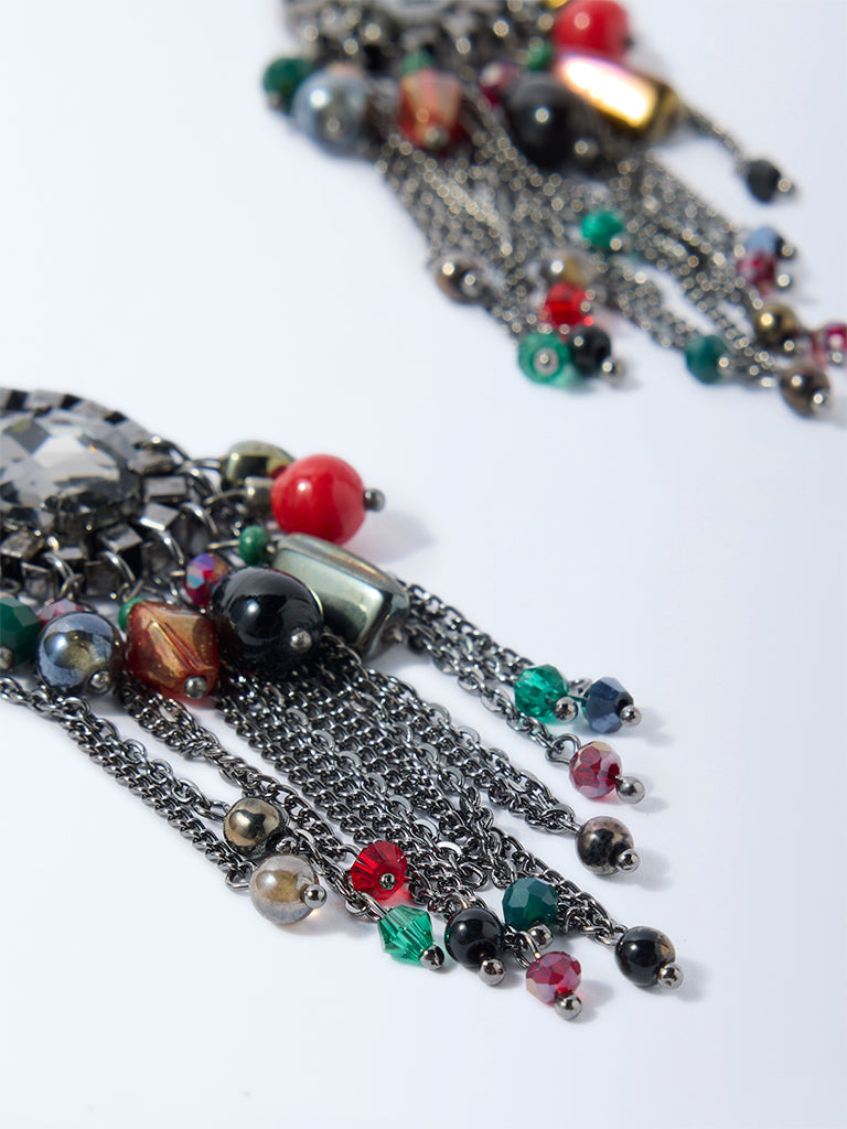These silver earrings from Westside Accessories feature a teardrop-shaped centrepiece with a faceted stone framed by intricate metallic detailing. Multiple layered chains cascade from the base, embellished with multicoloured beads that add contrast and dimension to the design. A statement accessory that merges bold textures with fluid movement, making it ideal for festive and evening edits.