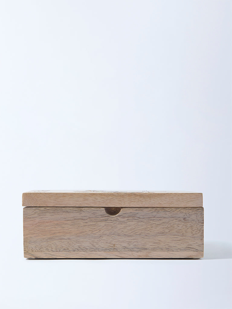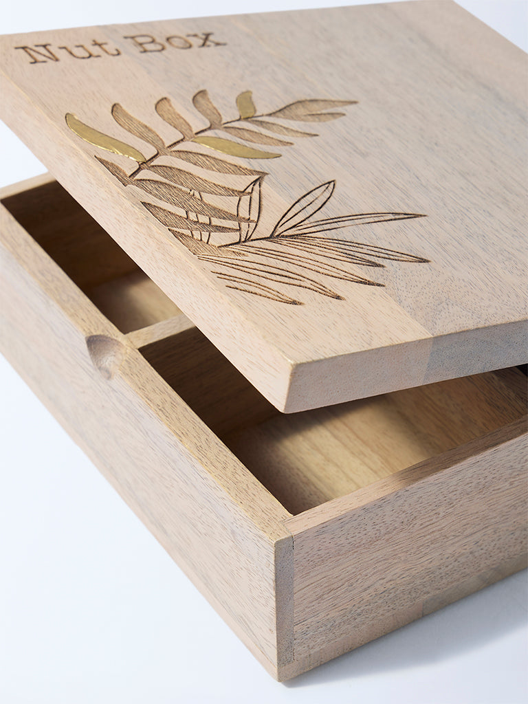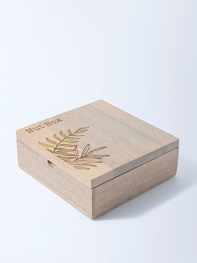 Serve and store in sophistication with this beige wooden nut box from Westside Home. Etched with graceful leaf patterns, it adds artisanal charm to casual snacking or festive entertaining. Its thoughtfully designed compartments keep assorted nuts, dry fruits, or treats neatly arranged, while the smooth wooden body ensures durability. More than storage, it is a conversation piece that elevates even the simplest offerings, turning everyday indulgence into a curated experience worth savoring.