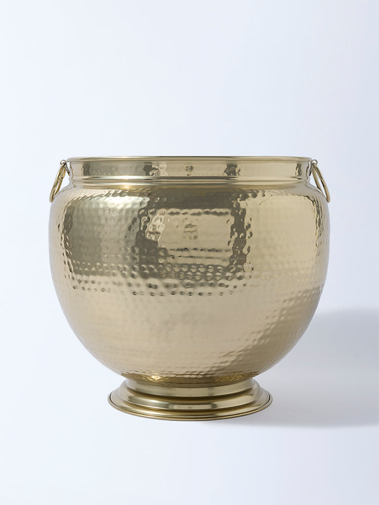 Infuse tradition with a contemporary twist through this gold urli planter from Westside Home. With its wide silhouette and artisanal hammered finish, it captures a warm, reflective glow that pairs beautifully with floating candles, petals, or lush greens. Ideal as a centerpiece for festive gatherings or a statement decor element for entryways and living rooms, its large size offers endless styling possibilities. Rooted in heritage yet reimagined for modern homes, it becomes a timeless accent of beauty and celebration.