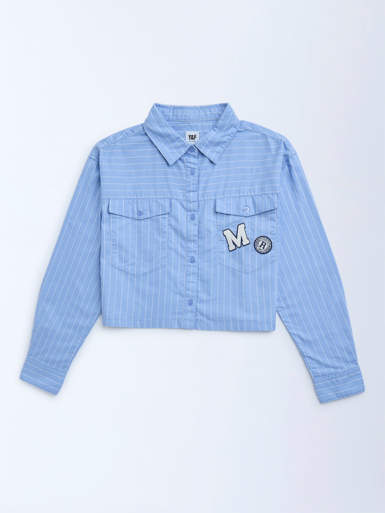 Style meets playtime in this chic blue shirt from Y&F Kids. Detailed with contrasting stripes for a modern vibe, it features a smart collar, button placket, full sleeves, and flap pockets for a stylish edge. Made from pure cotton, it keeps little ones comfortable while adding a polished touch to their outdoor adventures.
