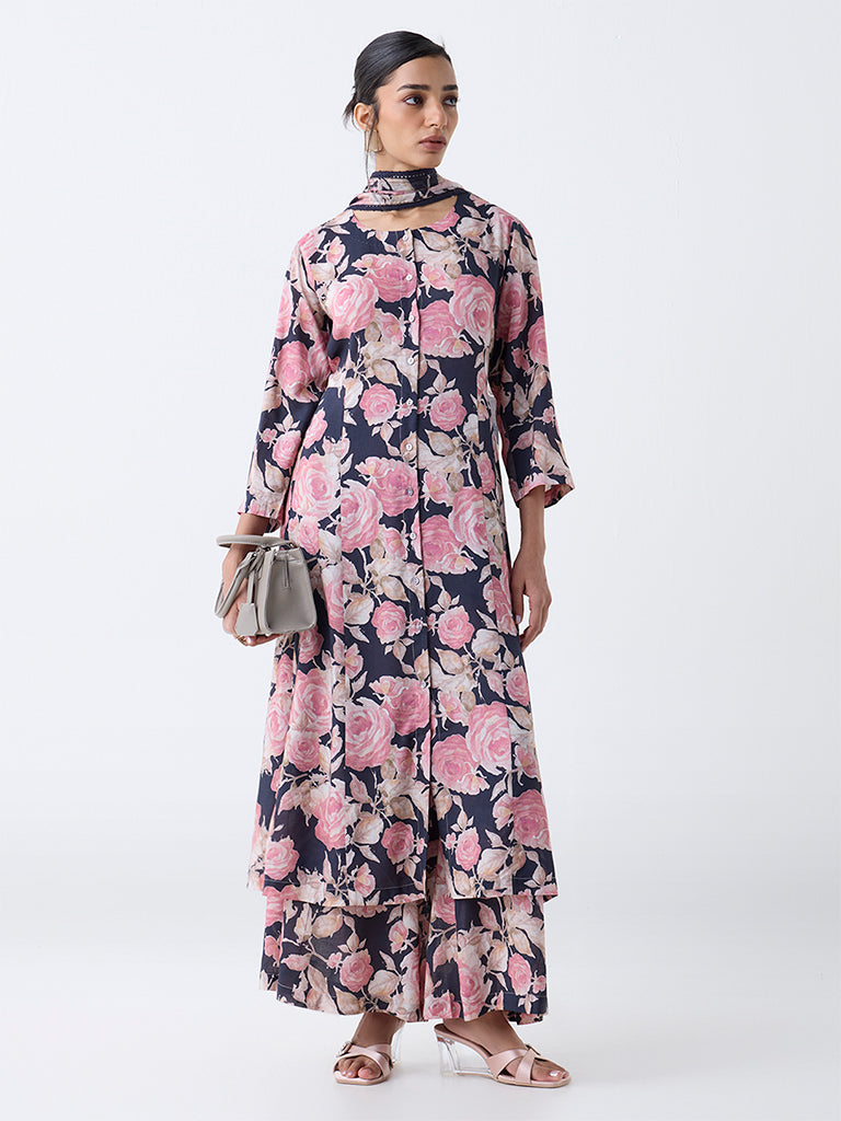 Structured in an A-line silhouette, this black kurta from Zuba blooms with graceful floral motifs for feminine charm. Woven from a super-soft fabric, it promises all-day comfort, while a round neck with a button placket, three-fourth sleeves, and a convenient slip pocket combine style with functionality.