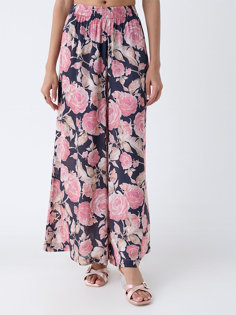 Enliven your ensemble with effortless flair with these black palazzos from Zuba. Detailed with graceful floral prints and woven from a lightweight fabric, they drape fluidly while the smooth elastic waistband ensures comfort from morning to night.