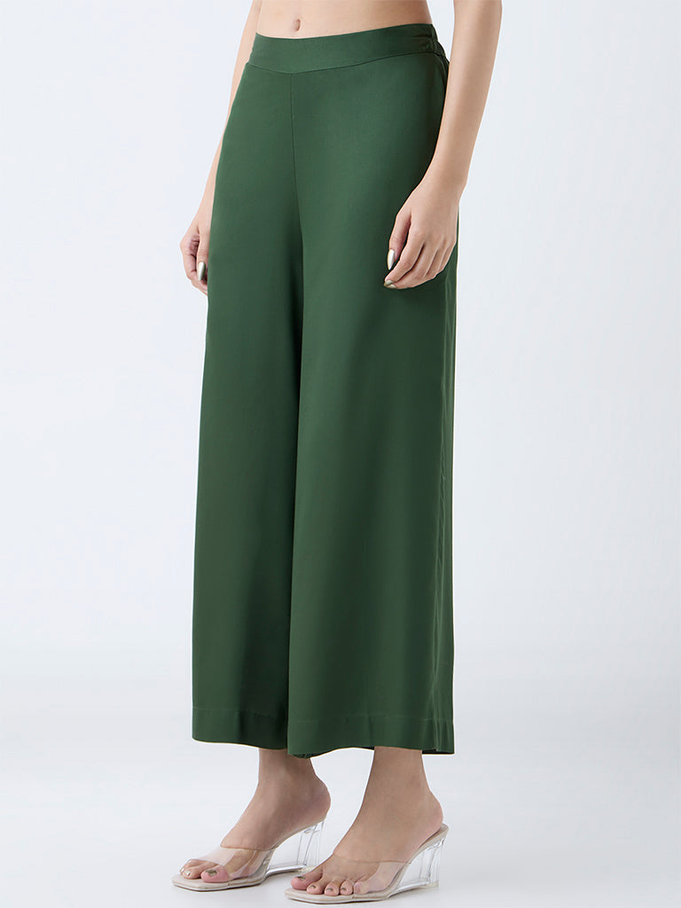 These dark green palazzos from Zuba bring ease and sophistication to ethnic dressing. Crafted with a smooth elastic waistband for a comfortable fit, they are tailored with side pockets for added functionality.