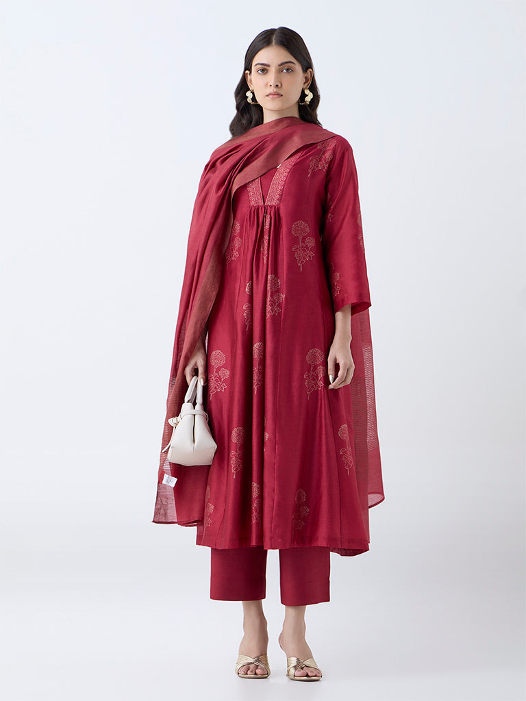 Add a statement layer to your festive repertoire with this red dupatta from Zuba, woven from sumptuous fabric for a graceful drape. Designed with contemporary striped detailing along one section, it introduces a modern accent to its timeless silhouette.
